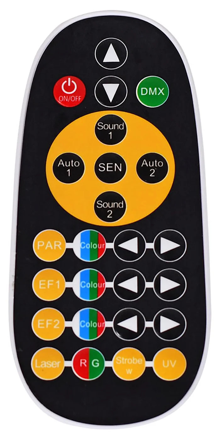For advanced control, the fixture supports 16-channel DMX operation, while an included IR remote control provides convenient wireless management of lighting effects.