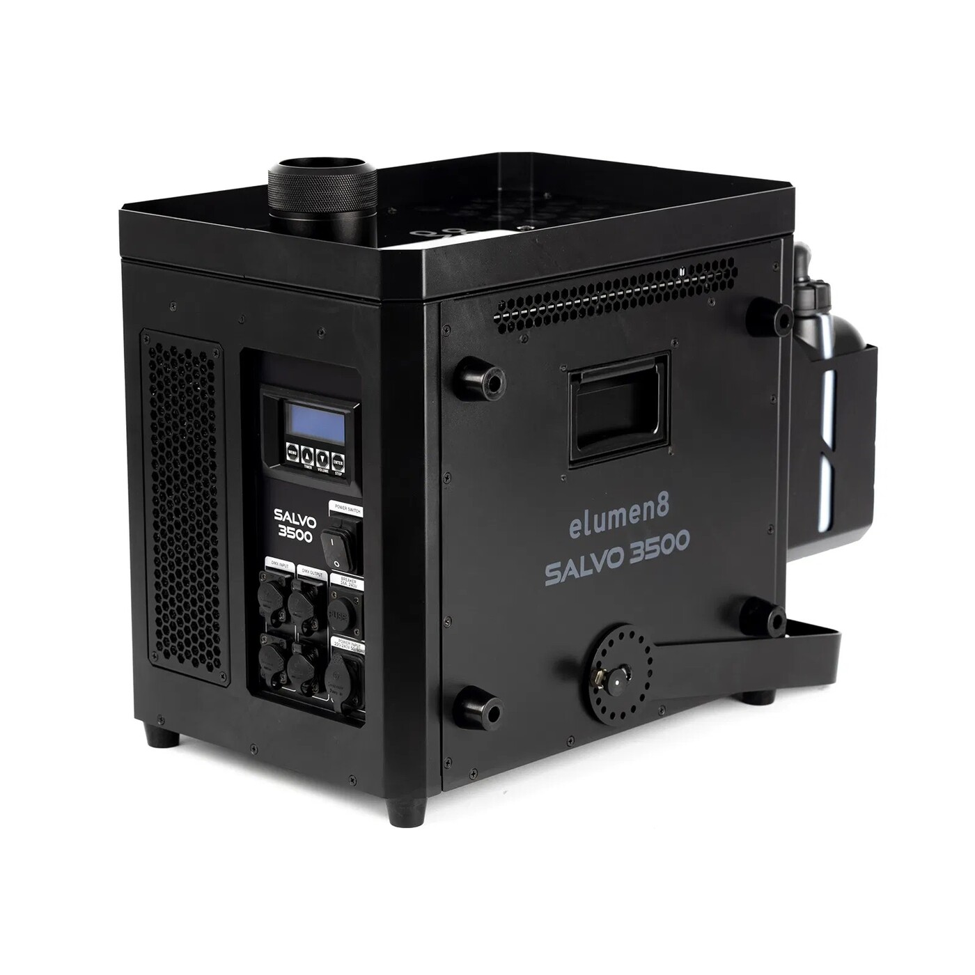 The Elumen8 Salvo 3500 delivers powerful bursts of coloured fog, combining 37 x 8W RGBA LEDs with a robust 3000W heater to generate up to 117,000 cubic feet of output per minute and project fog up to 15 metres. Paired with Equinox CO emulation fluid, its instant stop technology produces authentic CO-style effects. Built for flexibility, the unit can be mounted vertically, horizontally, or overhead using the supplied omega clamps. A user-friendly 4-button control panel provides timer, manual, and DMX operation, making the Salvo 3500 a versatile choice for stages, clubs, and live events.
