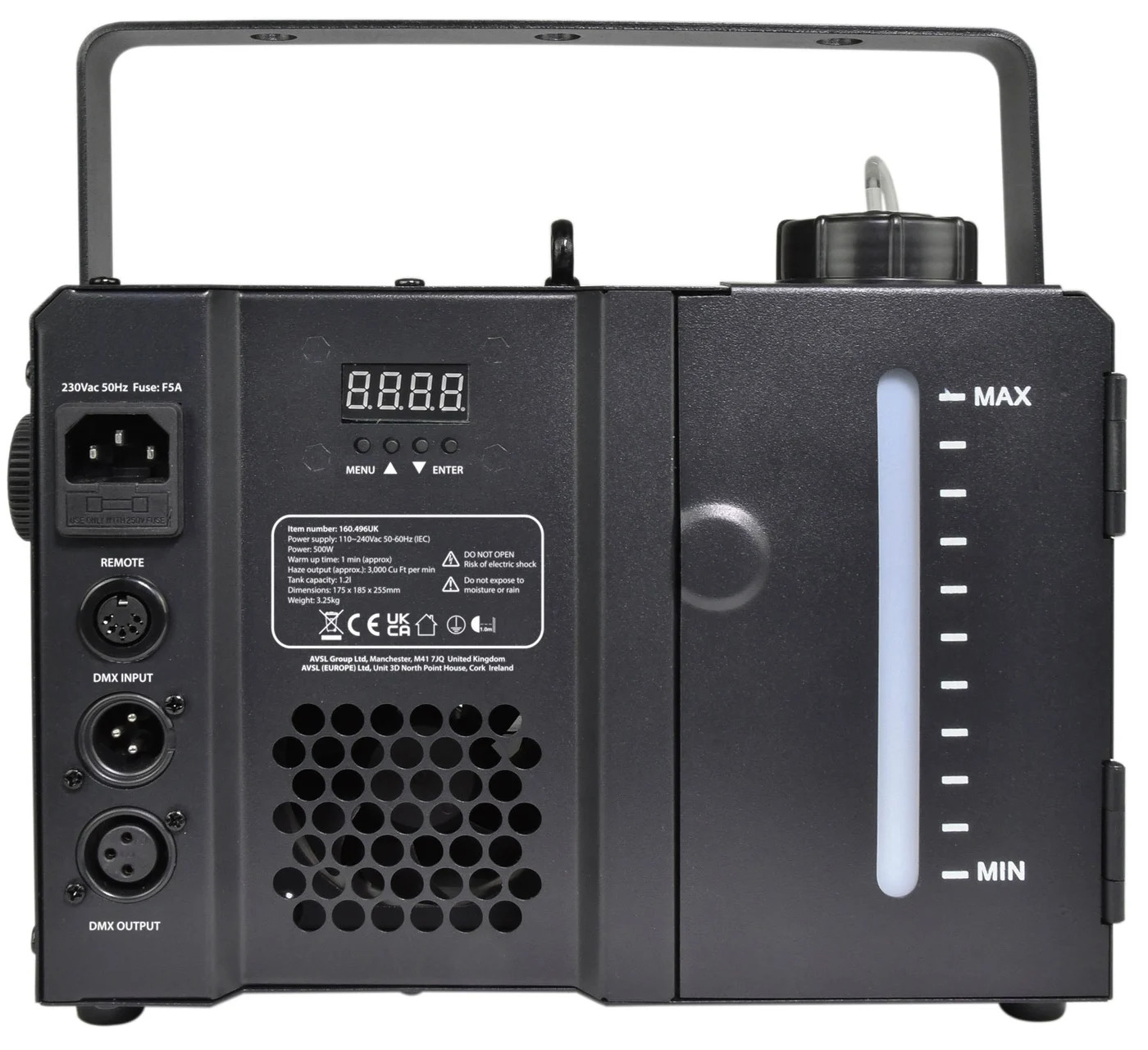 The ZEPHYR-500 is a digitally controlled, portable haze machine built with a rugged metal housing, ideal for small to medium-sized venues. Haze output is fully adjustable via the rear control panel, the included key-fob style RF wireless remote, or DMX control for seamless integration into professional setups.