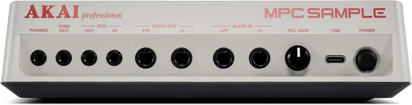 Built for portability, the MPC Sample includes a rechargeable lithium-ion battery offering up to five hours of use, along with a built-in speaker and microphone for standalone operation. USB-C provides power, audio, MIDI connectivity, and file transfer, while additional connections include stereo 1/4-inch inputs and outputs, headphone output, MIDI in/out with thru, and CV sync out.