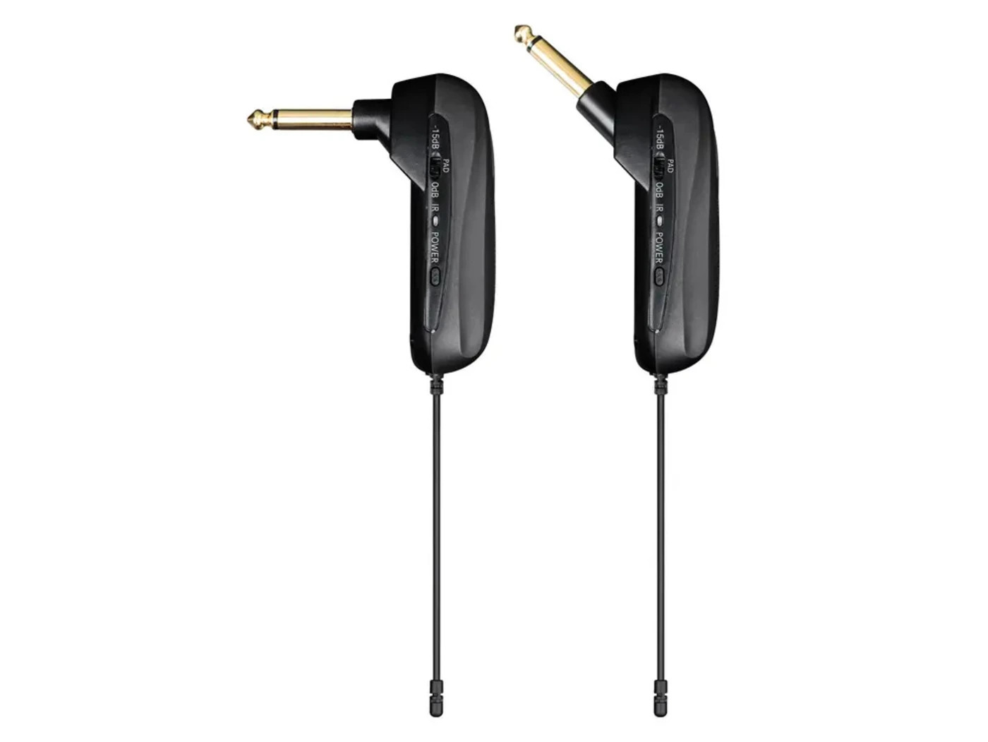 The transmitter is designed with interchangeable jack connectors, making it adaptable to different instrument shapes and playing positions. It also features a 15 dB pad, allowing it to handle a variety of output levels from different guitars and basses.