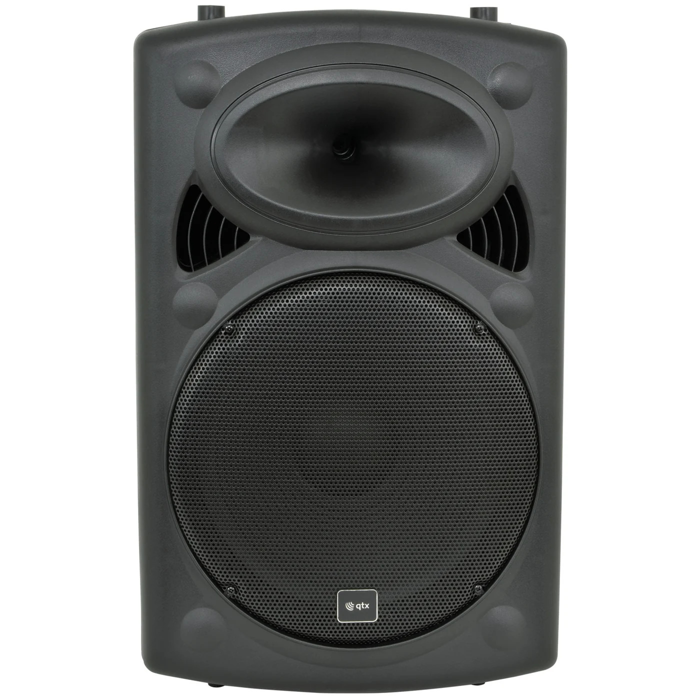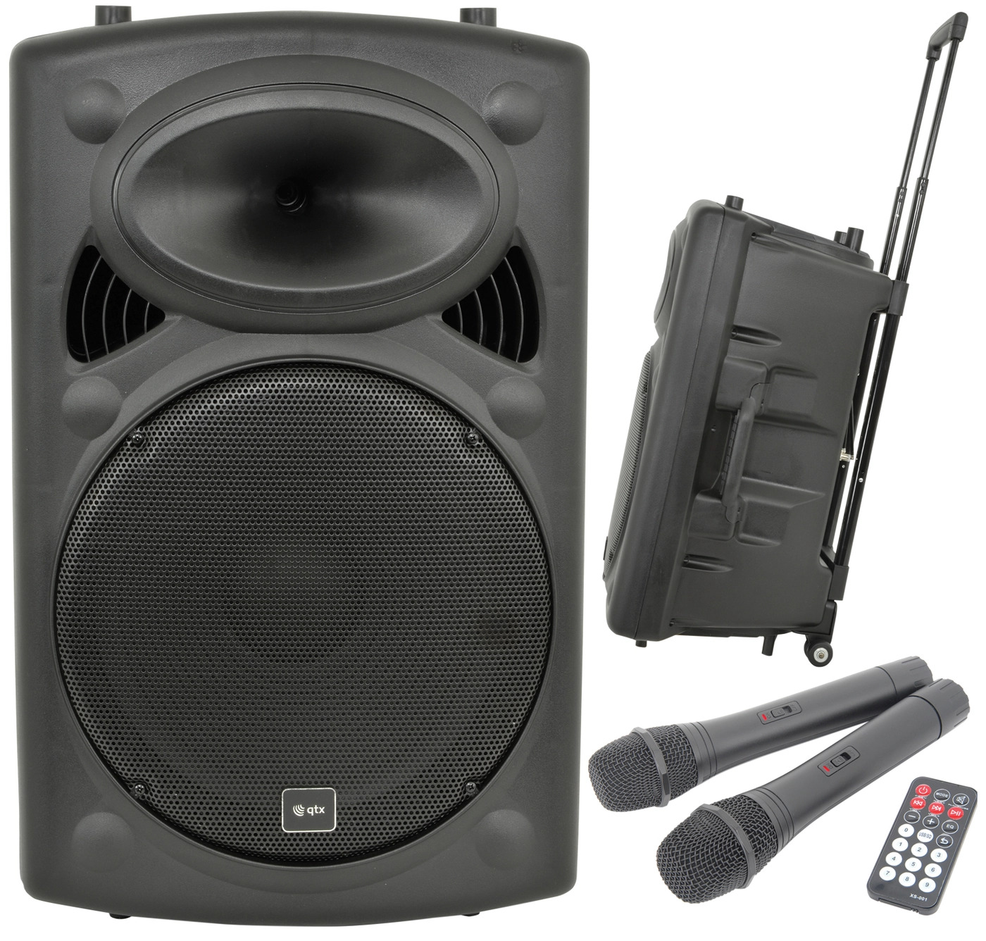 The QTX QR15PA is a compact, portable PA system built around the durable QR speaker cabinet. It features a built-in amplifier that can run on mains power or an internal rechargeable battery, driving both a main speaker and a compression horn for clear, powerful sound.